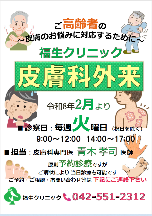 福生クリニックで皮膚科外来を開設しました。 毎週火曜日が診察曜日です。 皮膚の疾患でお悩み中、ぜひご相談ください。 詳細はこちら! ↓ ↓ ↓ ※画像をクリックするとダウンロードできる画面に移動します。